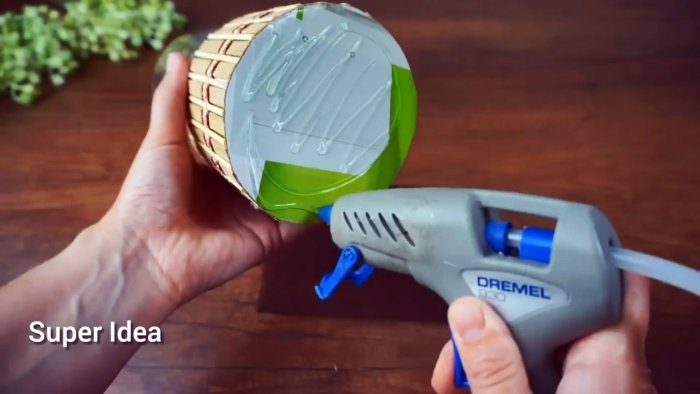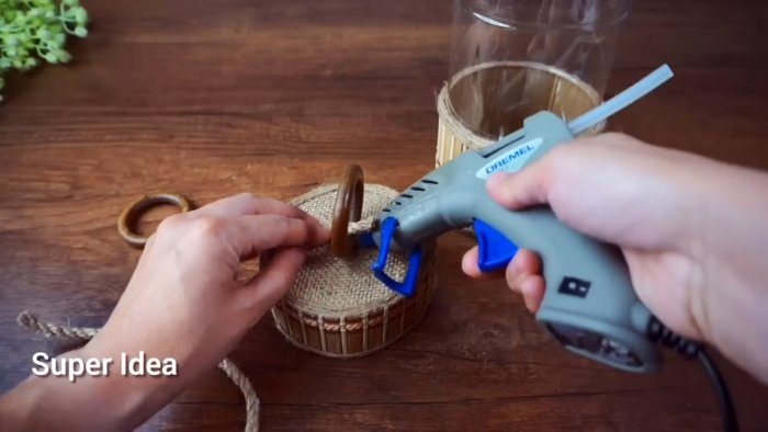 Отличие в том, что её не надо приклеивать к бутылке. Соединяем термоклеем боковину из циновки с крышкой из мешковины.