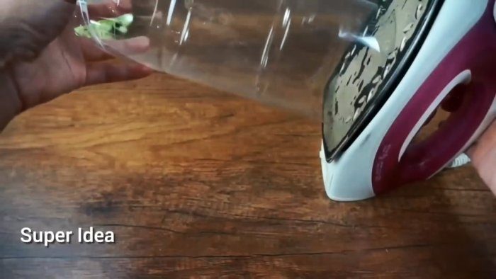 Линия отреза зависит от того, какого объёма контейнер вы хотите сделать. Если нужен большой – режем как можно ближе к горлышку, если маленький – режем ближе к дну. Линию среза обрабатываем горячим утюгом.
