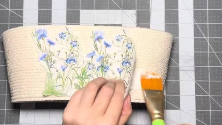 Также закройте канатом стенки снаружи и внутри. Теперь переходим к декору салфетками! Отделите цветной слой от бумажных, последний не понадобится. Приклейте рисунок к стенкам корзины с помощью клея ПВА.