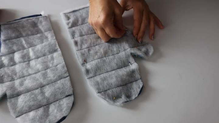 Соедините варежки и подкладку, прострочите по кругу. Оставьте место для выворачивания.