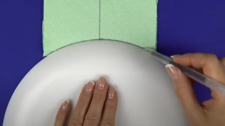 Для работы понадобится два квадрата эластичной ткани размером 28 см на 28 см. Каждый из квадратов разрежьте на две равные половинки и сложите их лицевой стороной к лицевой стороне. Нанесите на ткань следующую разметку: короткую сторону разделите пополам, проведите вертикальную линию. С помощью маленькой тарелки или блюдца прочертите округлую линию. Сверху отложите 16 см, а от нижней линии отложите 2 см.