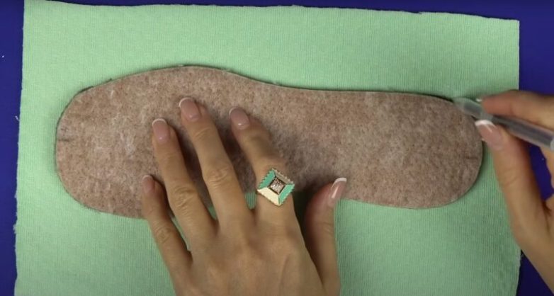 Возьмите стельку из обуви подходящего размера, перенесите ее очертания на ткань и дайте припуск на шов в 1 см.