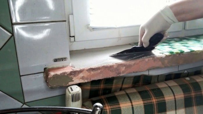 Процесс поклейки мозаики на подоконник