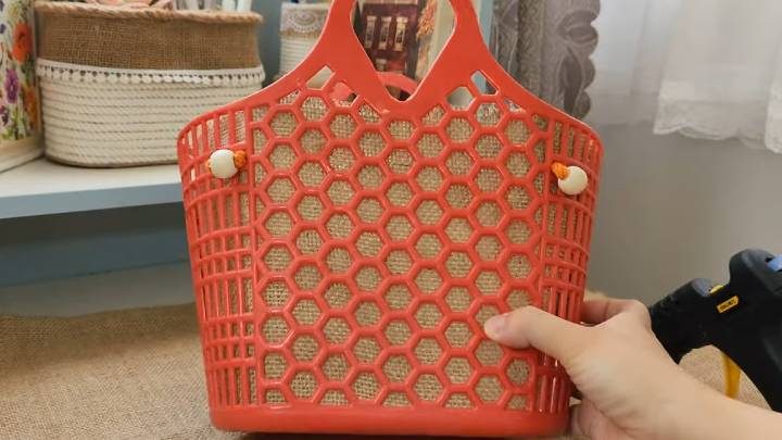 Поскольку пластиковая авоська «дырчатая», эту проблему также нужно решить. Вклейте внутрь мешковину или любую другую ткань.