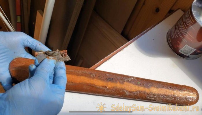Мне не нравился цвет ножек, поэтому я решила удалить старый лак. Я использовала средство для удаления краски B52. Нанёс его на дерево, подождал около 10 минут и соскреб ножом. После высыхания, отшлифовал наждачной бумагой.
