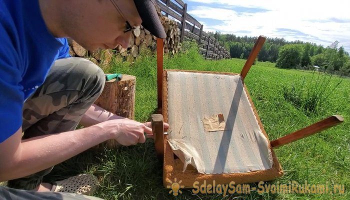 Первым делом снял старую обивку. Удалил все скобы и гвоздики. Открутил ножки и разъединил спинку и сиденье (так мне легче было с ними работать).