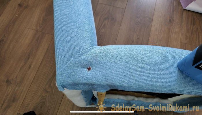 Старую фанеру со спинки кресла я заменил на новую. Для обивки я вырезал кусок ткани чуть большей по размеру чем спинка кресла. Затем нанес на нее аэрозольный клей и приклеил ткань. Спинку фиксировал нейлером при помощи мелких гвоздиков.