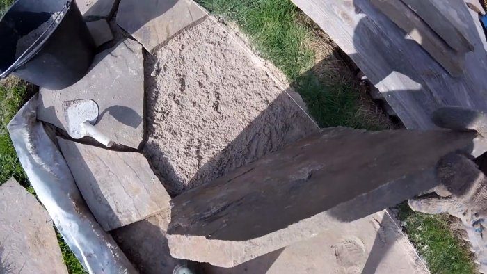 Далее подсыпаем тончайший слой песка, и на него выкладываем дикий камень.