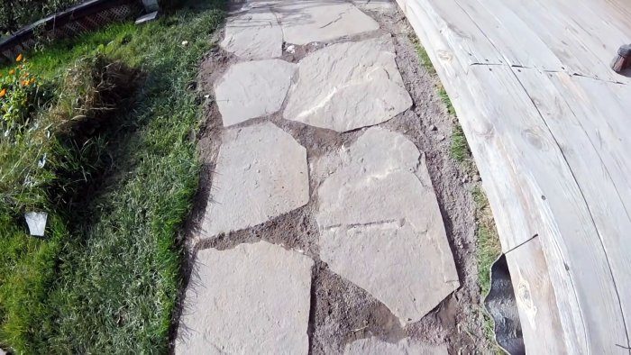 Можно уложить камень даже без подрезок болгаркой, но тогда дорожка будет иметь рваные края, что смотрится после зарастания травой очень даже достойно. Зазоры между плитками засыпаются песком, и проливаются водой, чтобы его уплотнить.
