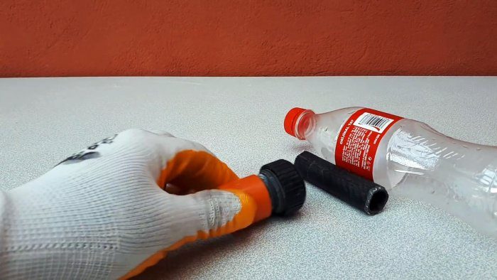 Берем бутылку и отвинчиваем крышку. Вставляем в горлышко кусок шланга. Если соединение не плотное — подматываем изолентой. Чтобы бутылка не слетела при эксплуатации, забьем гвоздик в горлышко.