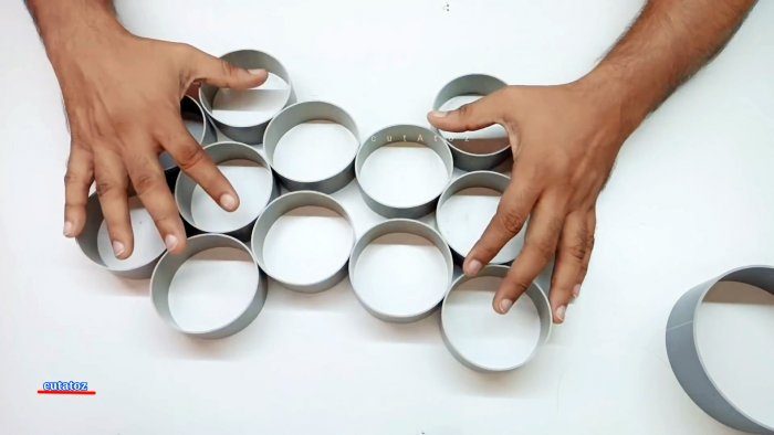 Из большой трубы отрезаем кольцо шириной 38 мм для основания люстры. После этого из трубки 60 мм нарезаем 12 колечек шириной по 28 мм. Важно чтобы срезы были ровными.