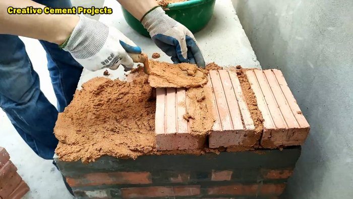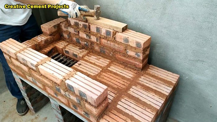 Замешиваем огнеупорный раствор из глины, цемента, песка и воды, и укладываем на цементную плиту по всей ее поверхности кирпичи, уплотняя и заглаживая швы. Для лучшей осадки кирпичи простукиваем молотком через деревянный брус.