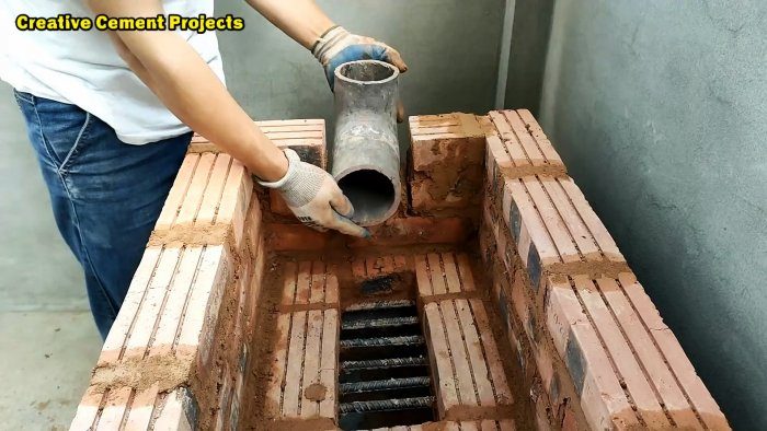 В проем задней стенки топки устанавливаем асбестоцементное колено, ориентируя его наружную короткую часть строго вертикально. Колено снаружи заполняем и обмазываем огнеупорной массой.