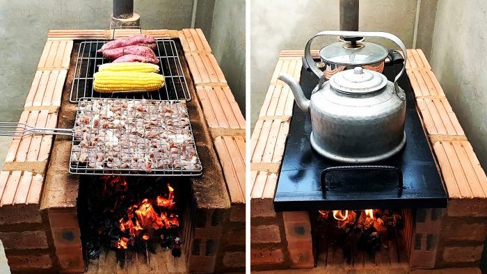 Дровяную печь-мангал стоит сделать на даче или возле дома только ради аромата дымка, который будет исходить от пищи, приготовленной на ней. Предлагаемый вариант печи отличается простой конструкцией, недорогими материалами и завидной экономичностью: на одной растопке можно приготовить все блюда даже для большой семьи.
