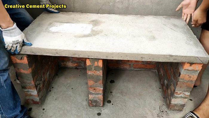 На основание печи наносим цементный раствор, переносим и аккуратно укладываем цементную плиту на нее.