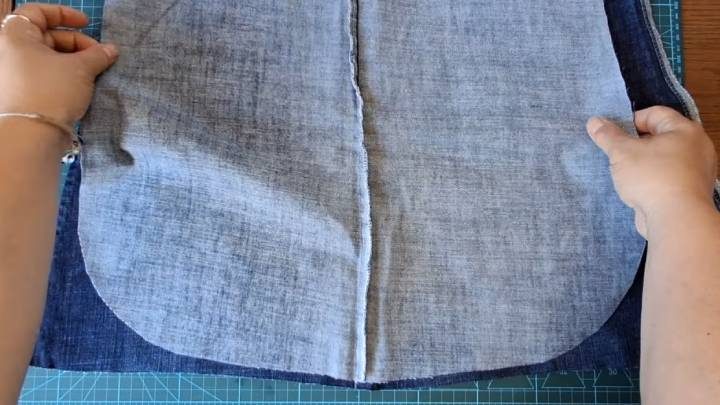Штанины распорите по краю, раскройте полотно. Сумка будет полукруглая, а потому понадобится 2 детали, как на фото ниже (и столько же из тонкой ткани для подкладки).