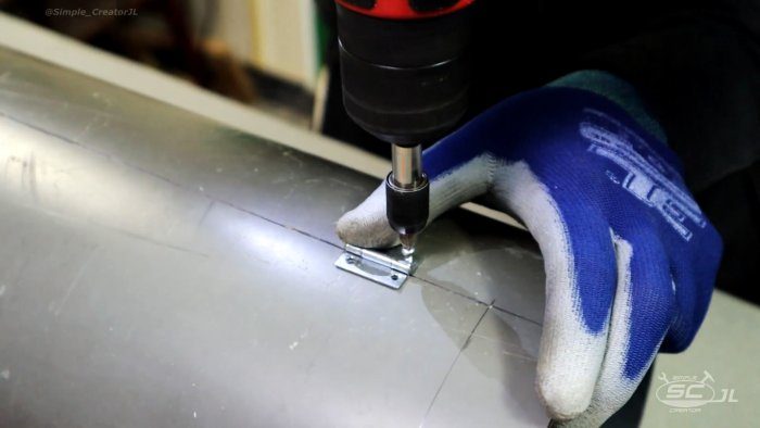 Устанавливаем вдоль прорези на равном расстоянии три мебельные карточные петли и прикручиваем их шурупами с двух сторон от прорези. То же самое повторяем и со второй боковой линией.