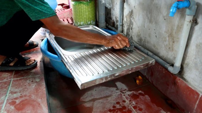 Берем старую мойку, и снимаем с нее все сантехнические устройства (сифон, трубы и т.д.) так, чтобы осталась только металлическая конструкция. Тщательно зачищаем, и моем поверхность мойки со всех сторон.