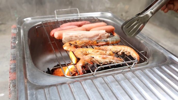 На раковину ставим решетку и жарим любое блюдо, которое готовится на открытом огне.