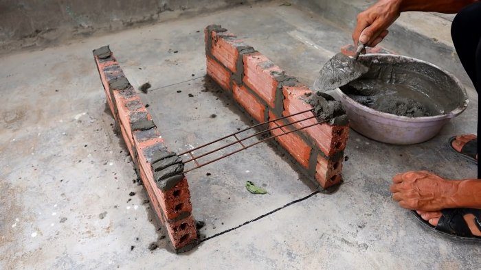 На выложенные стены с одного торца кладем кусок металла или крепкой сетки, которая будет выполнять роль перемычки. На импровизированную перемычку кладем ряд кирпичной кладки, и выкладываем третий ряд двух боковых стен.