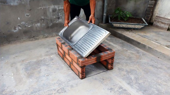 Сверху на кирпичные стены устанавливаем мойку раковиной в сторону без стены. Сливное отверстие закрываем металлической пробкой или куском металла.