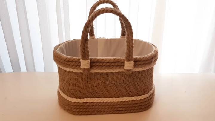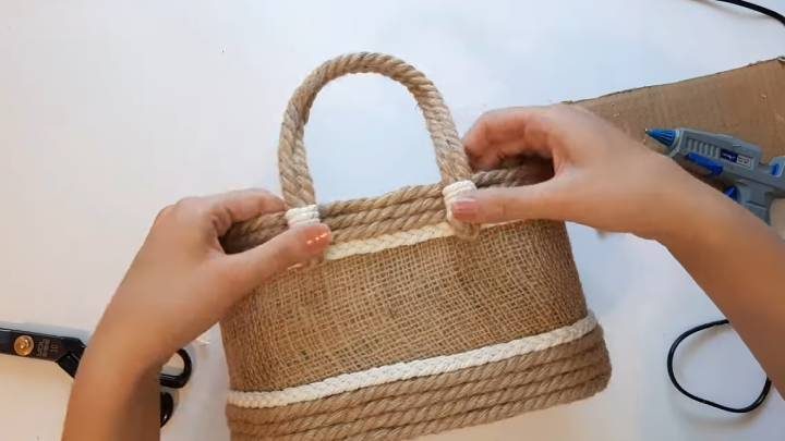 Наконец, из джутового каната сделайте самые простые ручки. Оберните их пряжей. Приклейте термопистолетом.