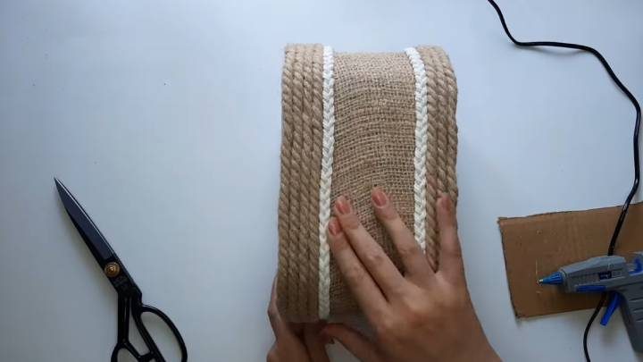 Внутрь приклейте ткань. Снаружи — мешковину.