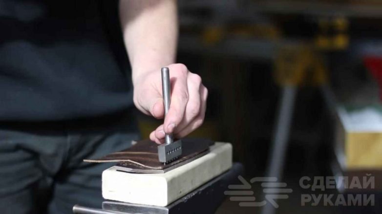 На следующем этапе работ по краям кожаной заготовки необходимо будет сделать одинаковые отверстия, находящиеся на равном расстоянии друг от друга. Для этого мастер использует специальный строчный пробойник.