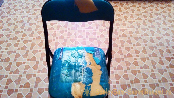 Сидушку декорировали, получилось неплохо, в тон исходному цвету стула. Теперь нам нужно переключить свое внимание на спинку стула, где также «поработали» коты.