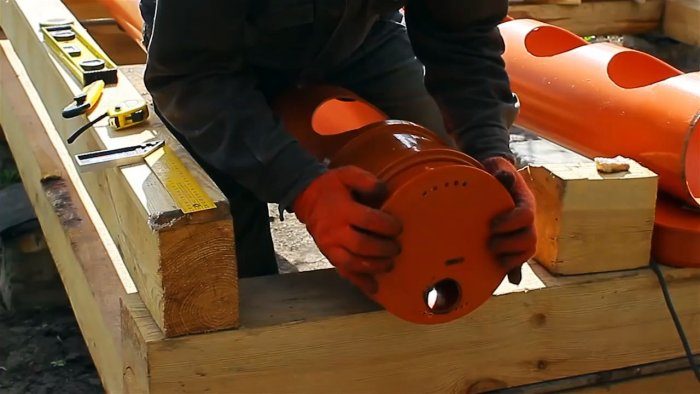 После этого берется заглушка 200 мм, в ней проделывается ближе к краю отверстие под раструб трубки 40 мм.