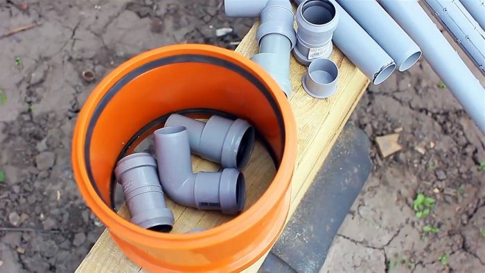 С другой стороны на трубку полива ставится соединительная муфта, колено, обычная муфта и переходник на 50 мм. При этом в стенке раструба оранжевой трубы делается небольшое отверстие для вывода переходника. Затем следует заглушить трубу 200 мм второй крышкой.
