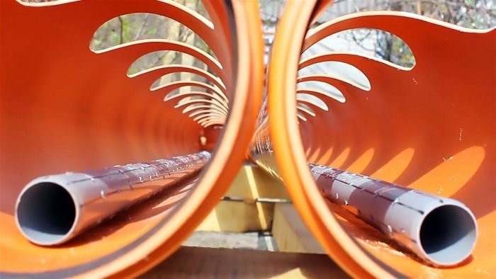 На оранжевую трубу устанавливается соединительная муфта. Перед этим резинку в ней и саму трубу лучше смазать жидким мылом, салом или маслом. Тогда муфта сможет налезть без усилий.