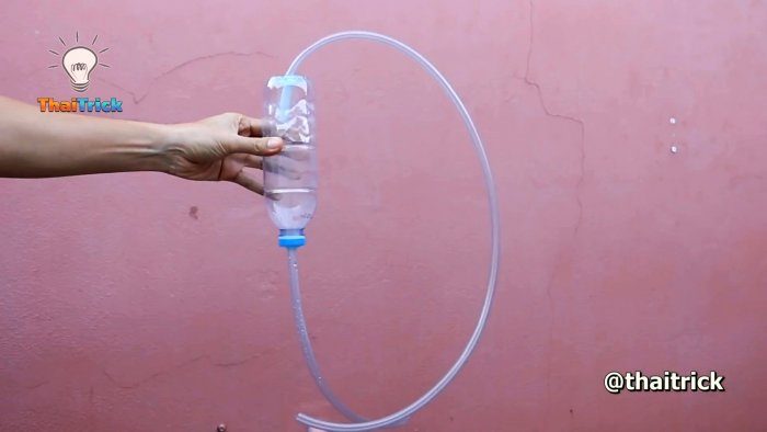 Кидаем один конец шланга в резервуар, другой затыкаем пальцем. Бутылку сжимаем.