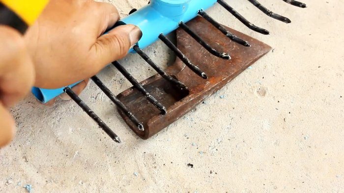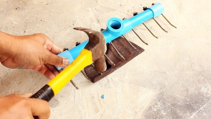 Далее саморезы подгибаются ударами молотка, чтобы зубья лучше захватывали и удерживали мусор при работе. После этого в резьбу тройника закручивается переходник с длинной трубой черенком.