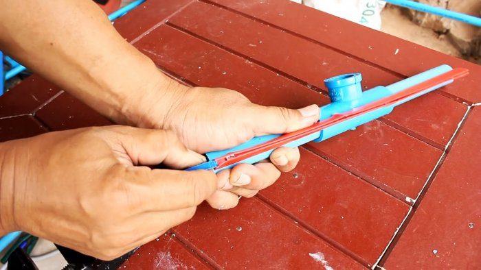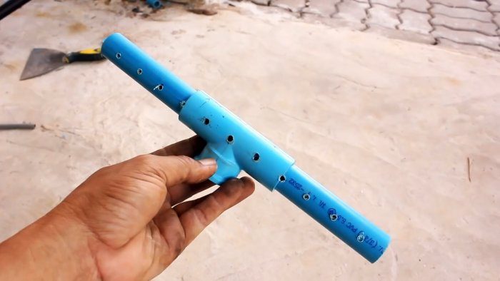 Такой скребок имеет схожую конструкцию с граблями. С помощью тройника и трубок нужно собрать для него такой же каркас. К нему на саморезы прикручивается стартовый профиль для ПВХ вагонки.