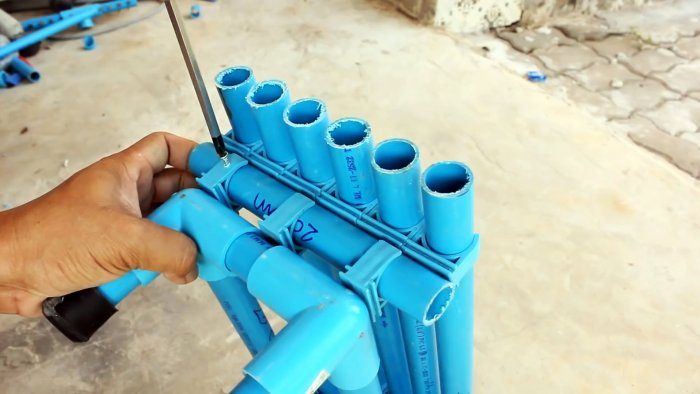 В завершение в тройники каркаса вставляются ножки длиной по 10 см с заглушками. Для надежности клипсы с трубками лучше дополнительно соединить саморезами.
