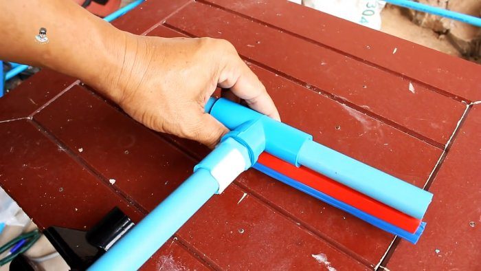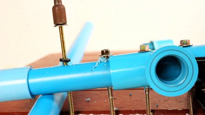 Необходимо попарно соединить между собой 4 угловых ПВХ тройника отрезками труб по 10 см. Далее детали собираются с помощью двух трубок по 25 см.