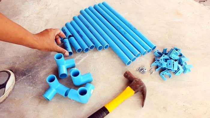 После монтажа водопровода из клеевых ПВХ труб, остается много обрезков. Докупив немного фитингов, их можно пустить в дело, делая весьма полезный для загородного дома инвентарь и мебель. Из труб легко собрать много чего нужного, причем сам процесс очень занимательный.