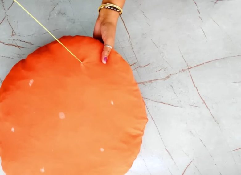С помощью длинной толстой иглы и толстой нити простегайте получившуюся подушку в пяти-шести точках. Это необходимо для того чтобы наполнитель внутри не сваливался.