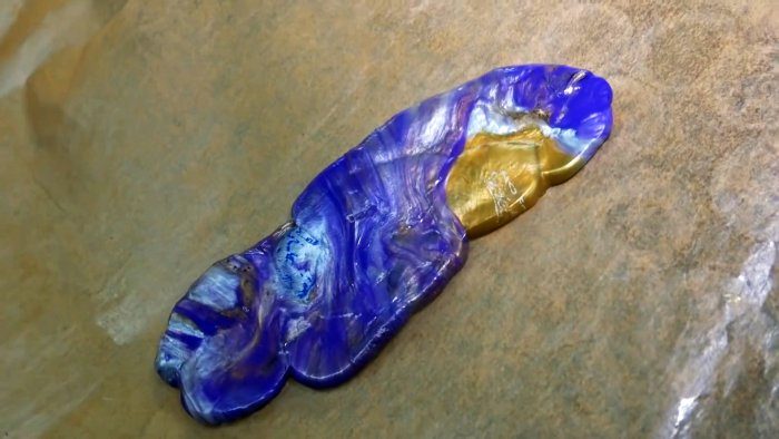 В гриль укладывается бумага в силиконе, и накладывается пластик. После размягчения он вынимается, вместе с пергаментом, и сминает в единую массу. Для этого потребуются очень плотные перчатки. Следует перемешивать массу, пока пластик не смешается. Потребуется пару раз возвращать ее в гриль и прогревать. Красивые разводы дает перекручивание, поэтому его нужно обязательно сделать в конце.