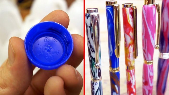 Переплавляя отходы из HDPE пластика можно делать различные поделки. Благодаря смешиванию сырья различных цветов, изделия из него получаются с красивыми разводами. Для постижения азов переработки пластика попробуйте себя в изготовлении из него корпусов шариковых ручек.