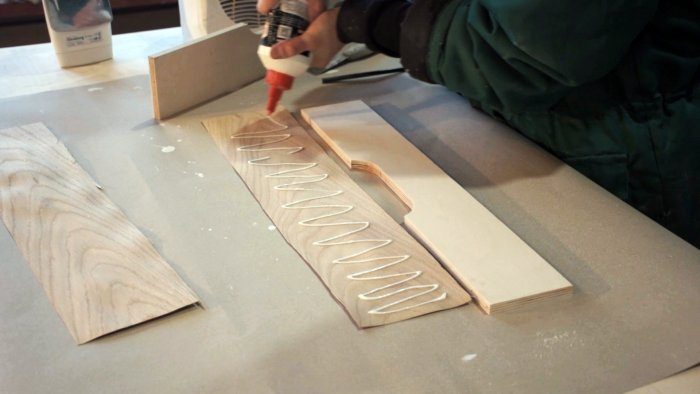 Для фасадов прикупил шпон уже не помню какого дерева. Клеил на клей ПВА столярный с помощью утюга. Как только высох клей, я отрезал лишний шпон копировальной фрезой.
