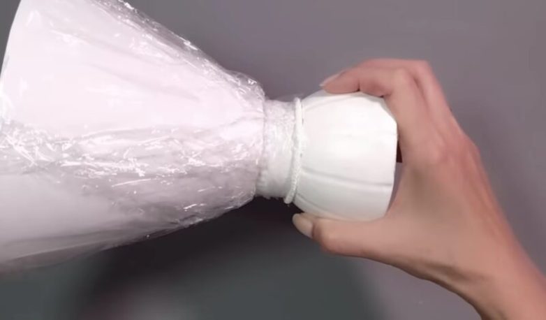 Оберните конус пищевой пленкой и закрепите его на основании будущей вазы.