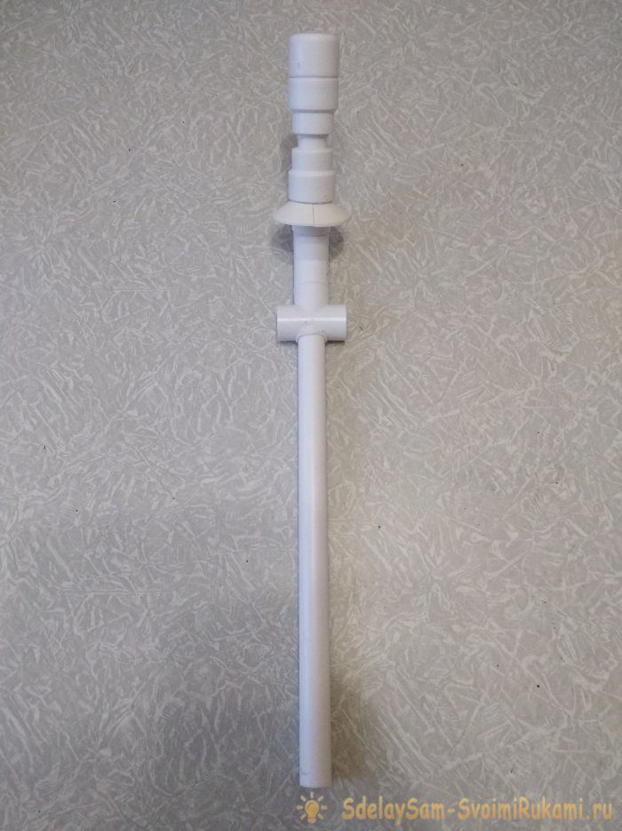 В последнюю очередь к свободному концу отрезка 90мм привариваем тройник ориентируя его центральный выход вертикально вверх и одновременно прижимаем изделие к плоскости пока пластик горячий, чтобы соблюсти прижатие по точкам соприкосновения основания.