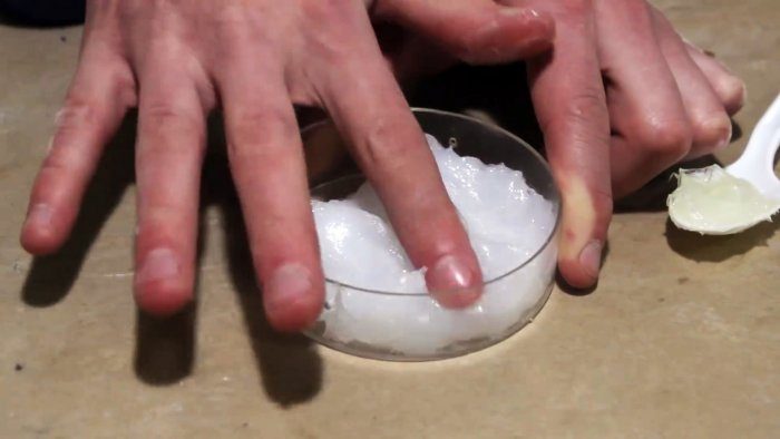 Теперь силикон не будет липнуть к рукам и будет похож на пластелин. На бутылку одеваем комок и разравниваем будущую пробку.