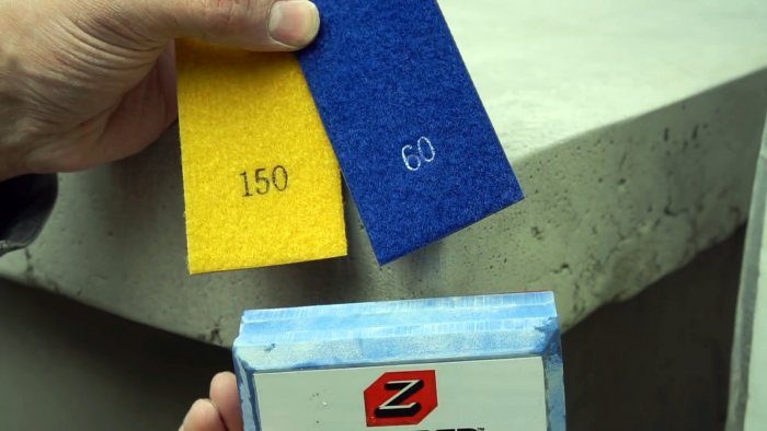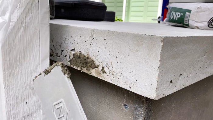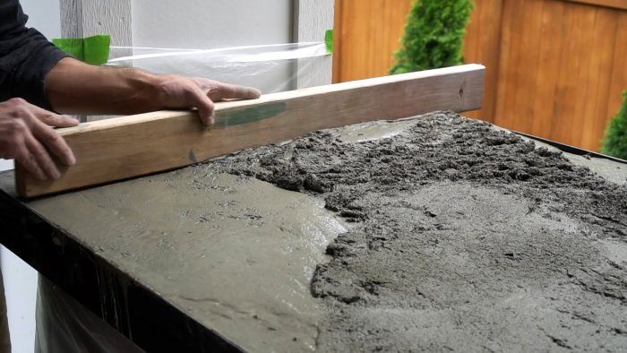 На второй день снимается опалубка, и открывшиеся рытвины замазываются свежим бетоном. Верхняя часть столешницы шлифуется абразивом сначала крупным, потом более мелким. Нужно добиться зеркальной гладкости.