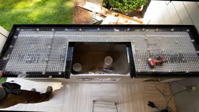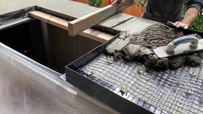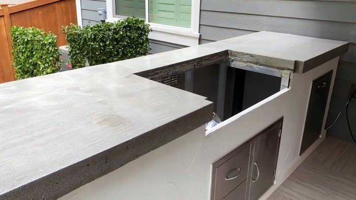 Если в столешницу планируется установка врезной мойки или плиты, то окна под это подготавливаются сразу и также окантовываются уголками, так как потом резать бетон будет слишком сложно.