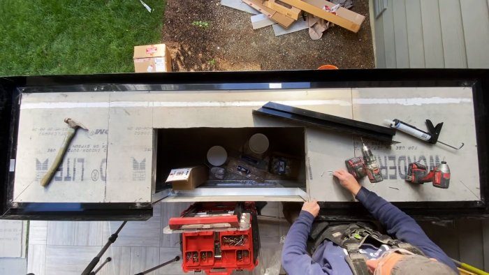 Стол или кухонные модули, на которые изготавливается столешница, устанавливаются по месту и выравниваются по уровню. После этого на них нужно надежно закрепить основание под столешницу. На него будет заливаться бетон, и крепится опалубка. Основание можно сделать из влагостойкой фанеры, плоского шифера или другого листового материала.По периметру основания прикручивается опалубка из пластикового уголка подходящей высоты.