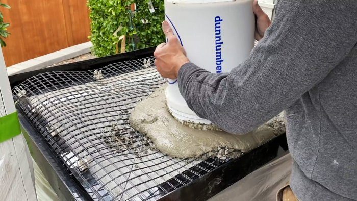 Затем готовится бетон. Нужно использовать готовую сухую смесь с фиброволокном и пластификаторами, которая согласно инструкции рассчитана на требуемую высоту заливки.