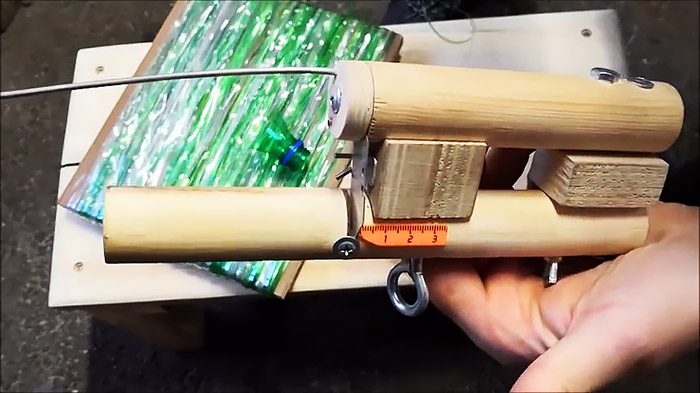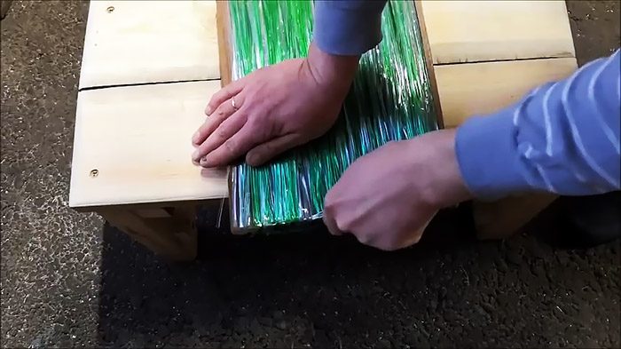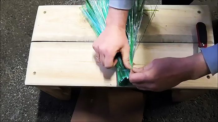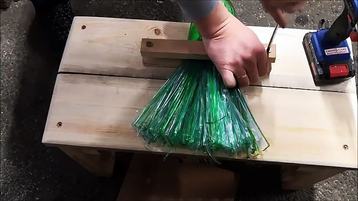 Далее заготовка зажимается в импровизированных тисках из скрученных саморезами реек. Пучок разравнивается, и верхняя бутылка усаживается феном. После этого метла закрепляется на черенке саморезом. Не обжатая юбка бутылки обрезается.